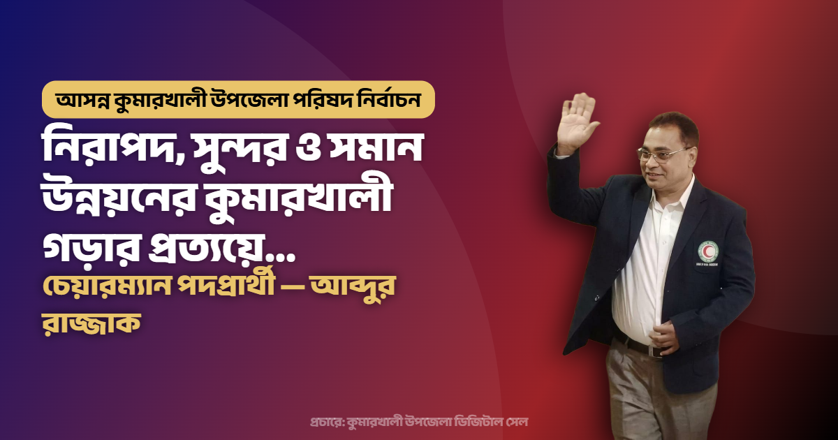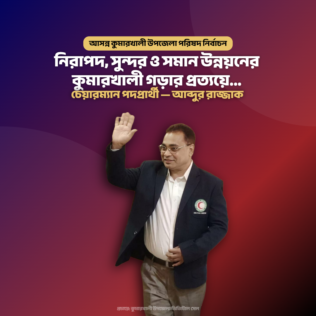 আমি বিশ্বাস করি, আপনাদের ভালোবাসা ও দোয়া সঙ্গে থাকলে কুমারখালীকে গড়ে তোলা সম্ভব একটি আধুনিক, প্রযুক্তিনির্ভর ও উন্নত উপজেলা হিসেবে; যেখানে তরুণ প্রজন্মের শক্তি হবে উন্নয়নের চালিকাশক্তি, আর নাগরিক সেবা পৌঁছে যাবে প্রতিটি ইউনিয়ন ও প্রতিটি মানুষের দোরগোড়ায়।